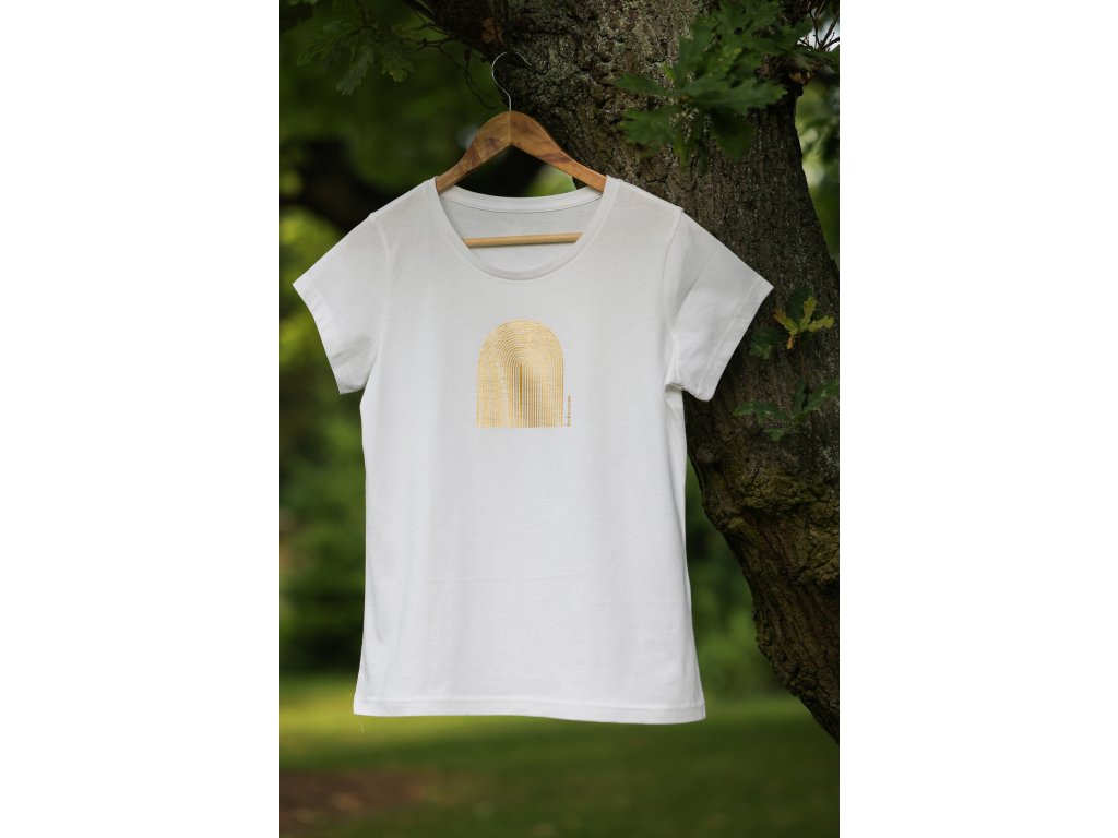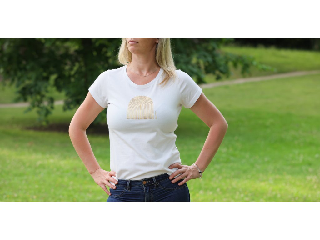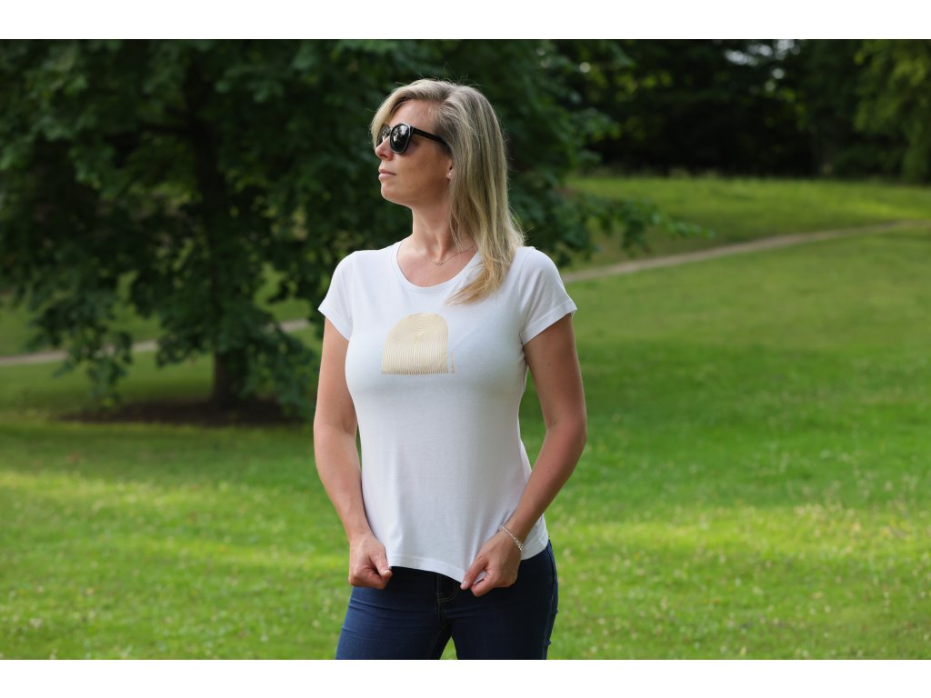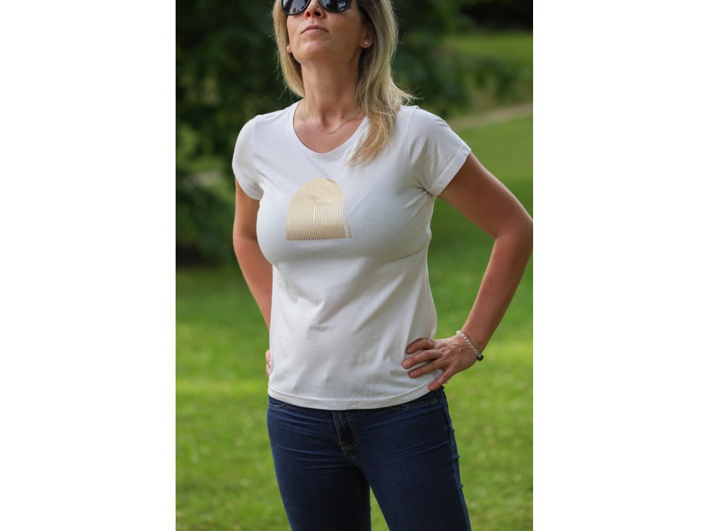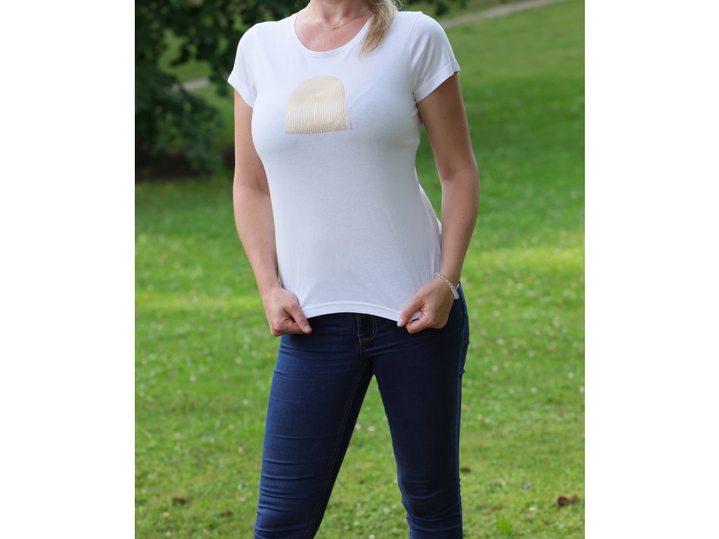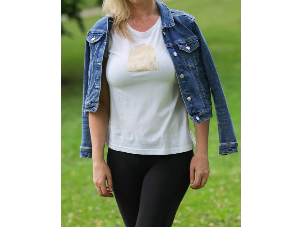 Bílé tričko s designovým tiskem zlaté duhy, velikosti XS s krátkými rukávy