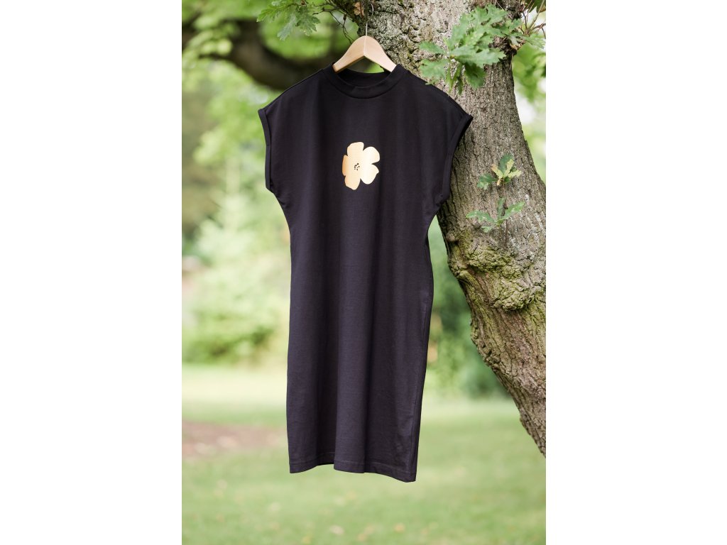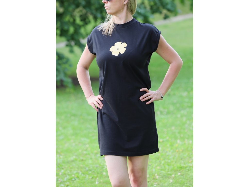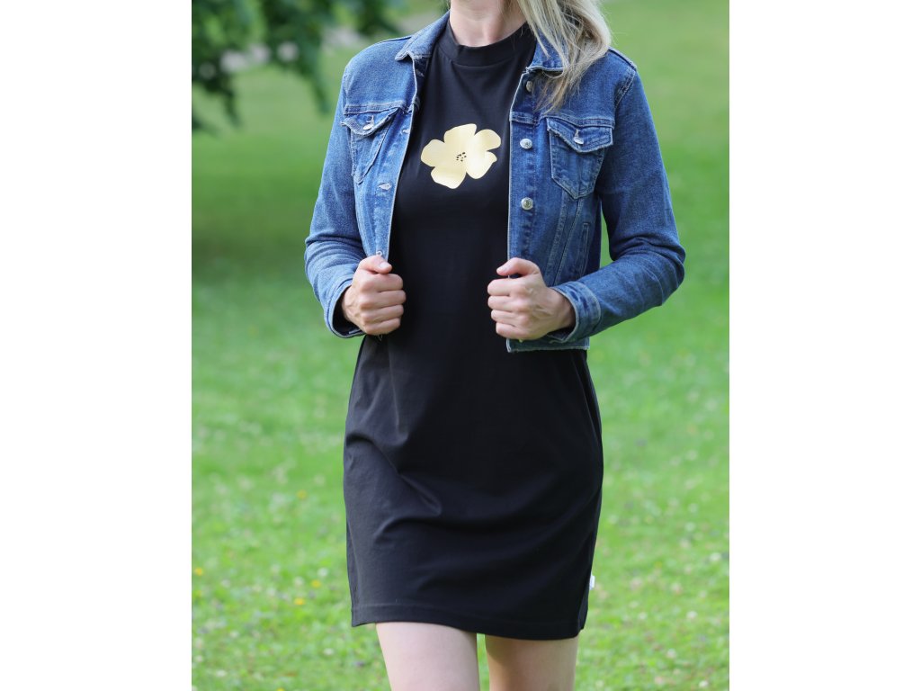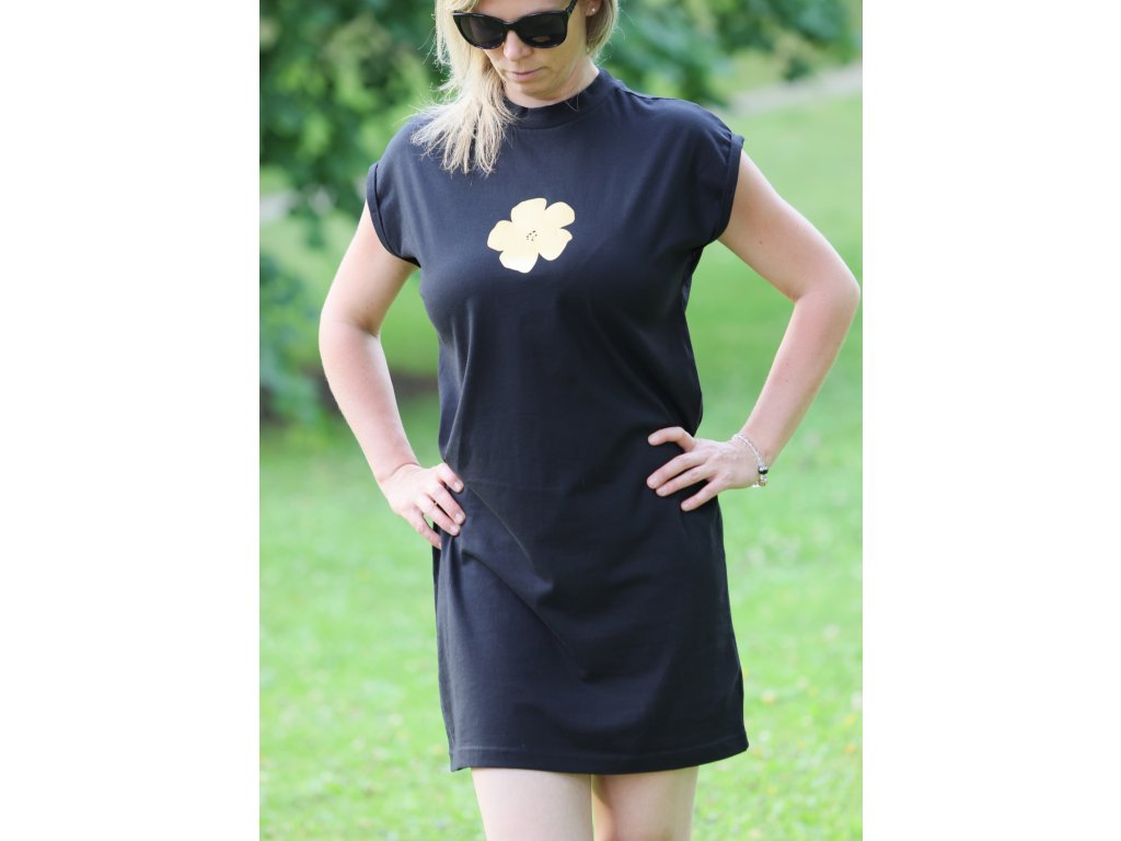 Černé šaty ze 100 % bavlny s designovým potiskem zlatého květu.