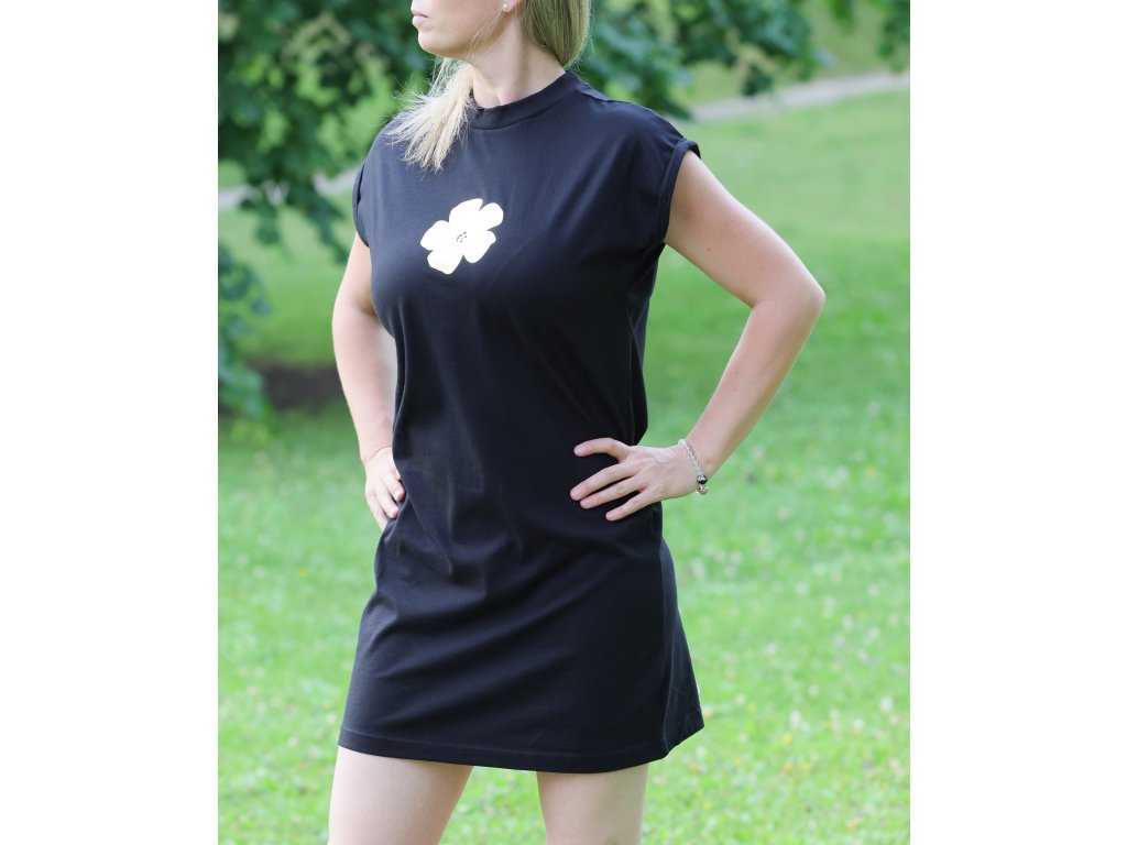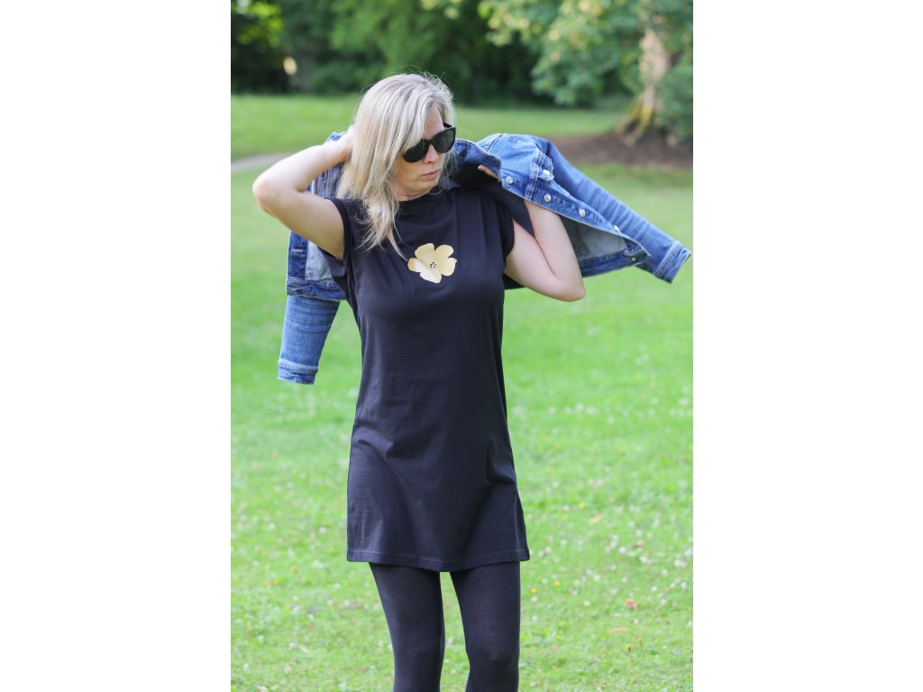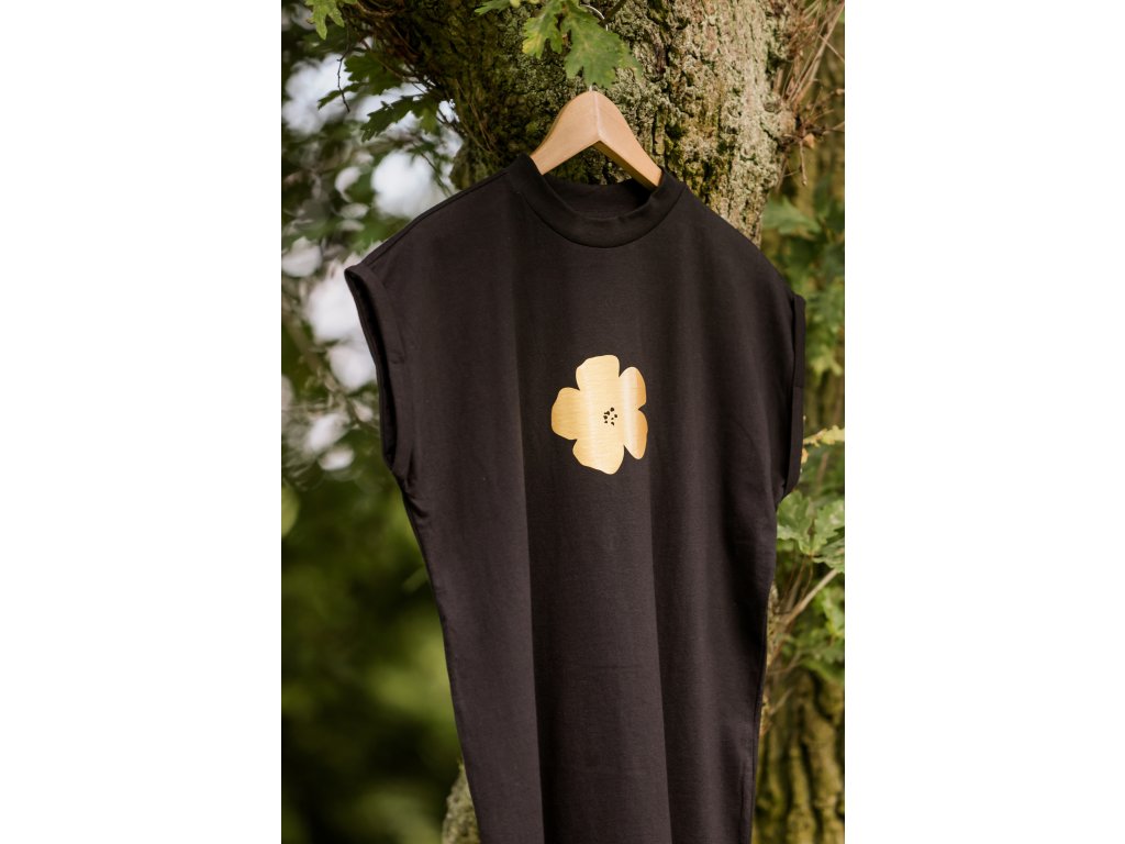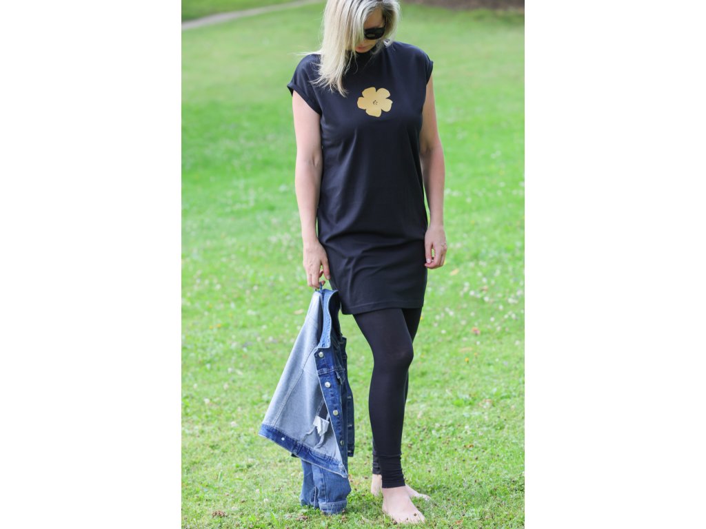 Černé šaty ze 100 % bavlny s designovým potiskem zlatého květu.