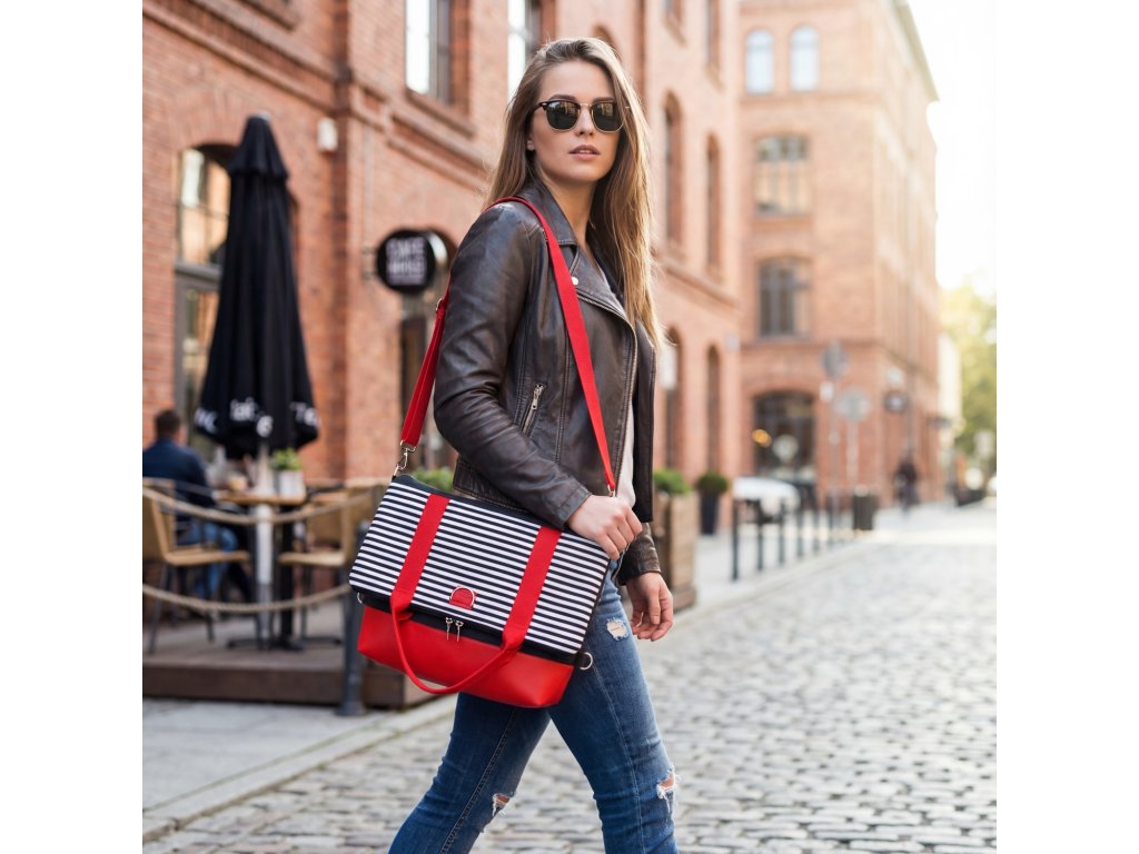 Kabelkobatoh úzký černobílý proužek s červenou koženkou