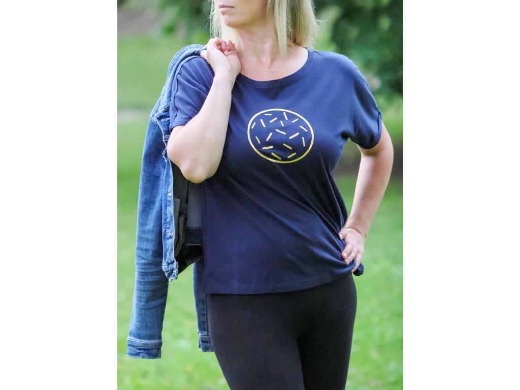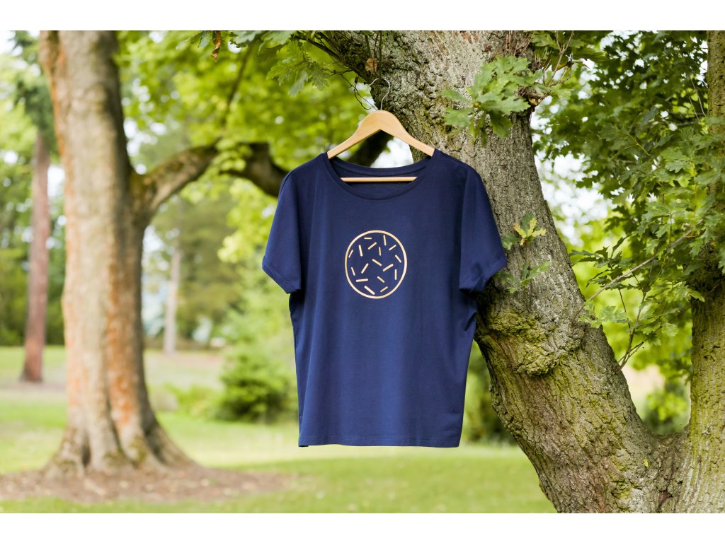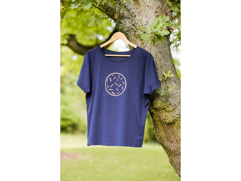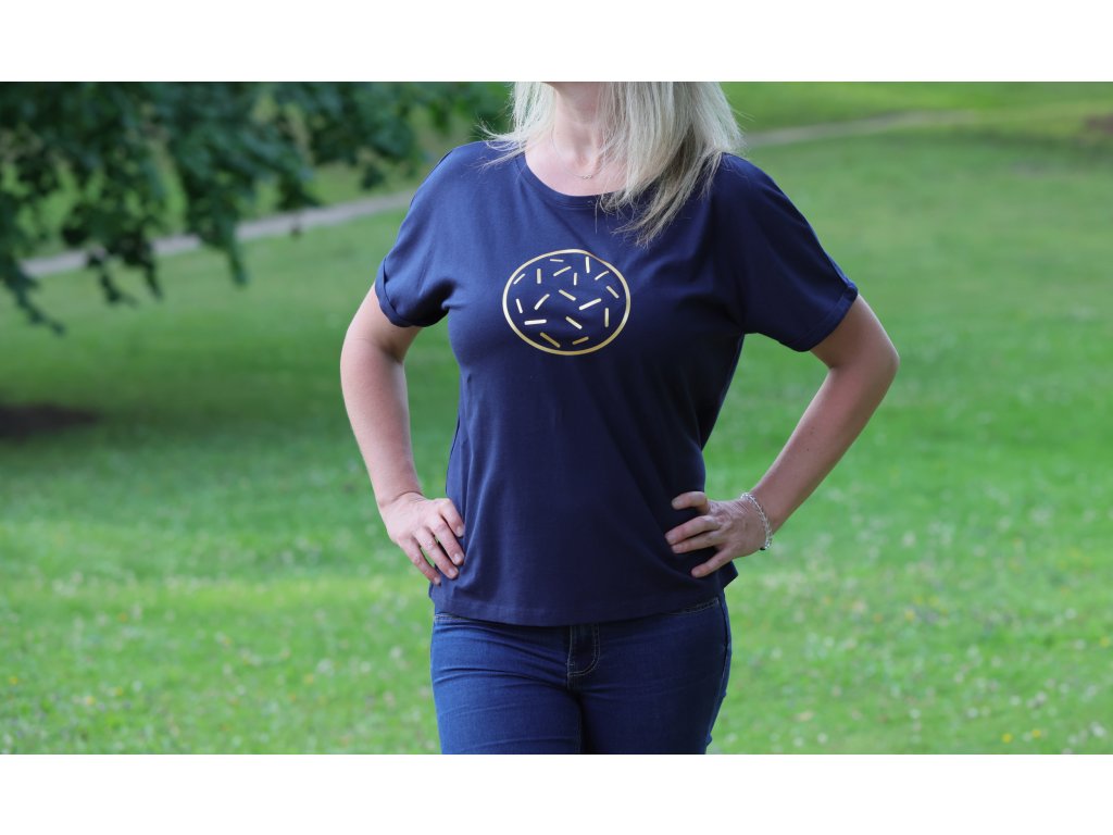 Modré tričko s designovým potiskem - zlatý čárkovaný kruh