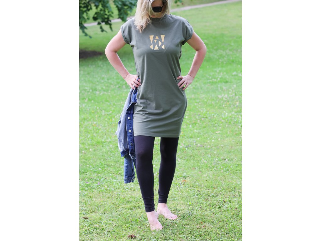Designové zelené šaty s motivem zlatých trojúhelníků